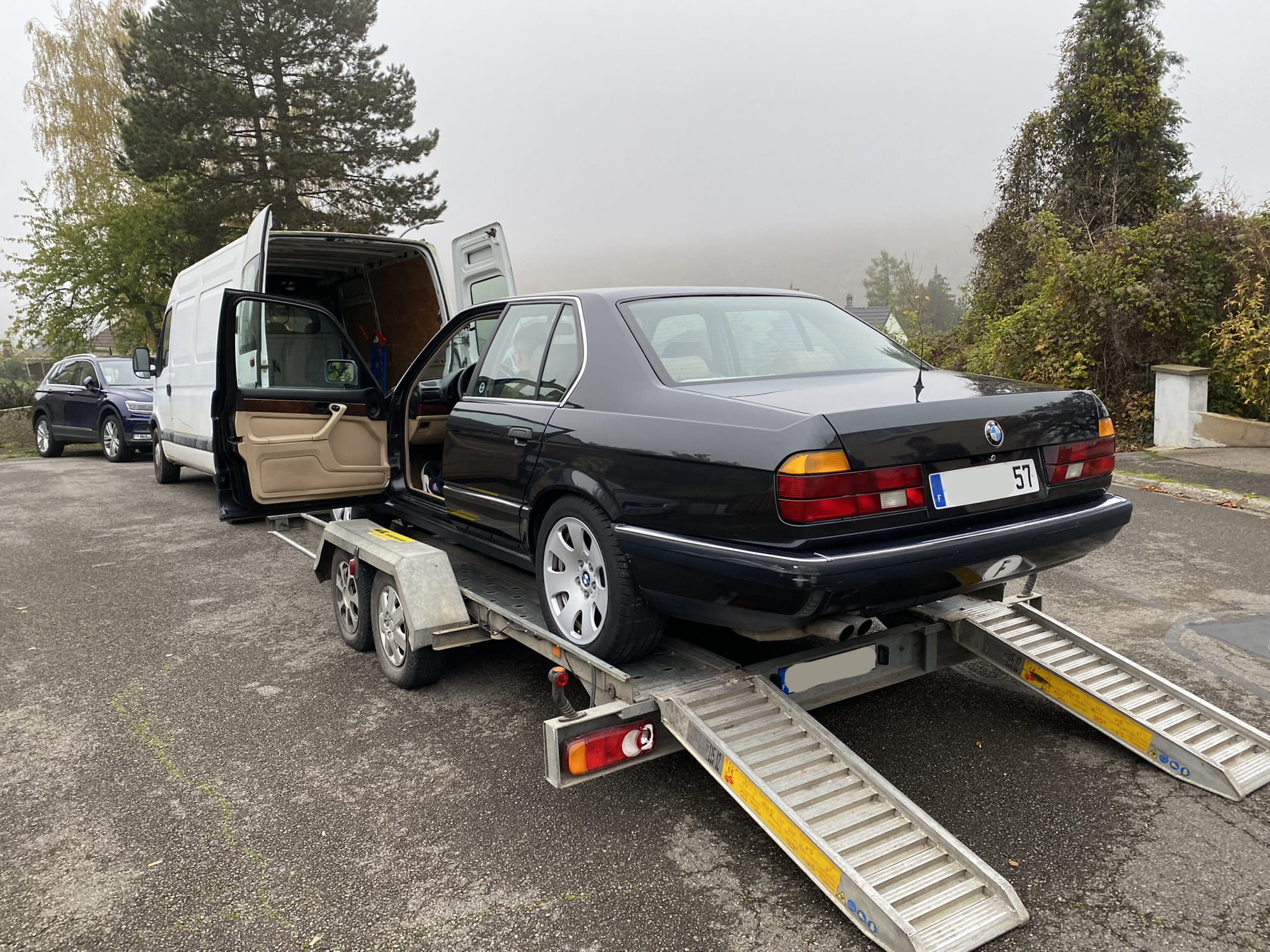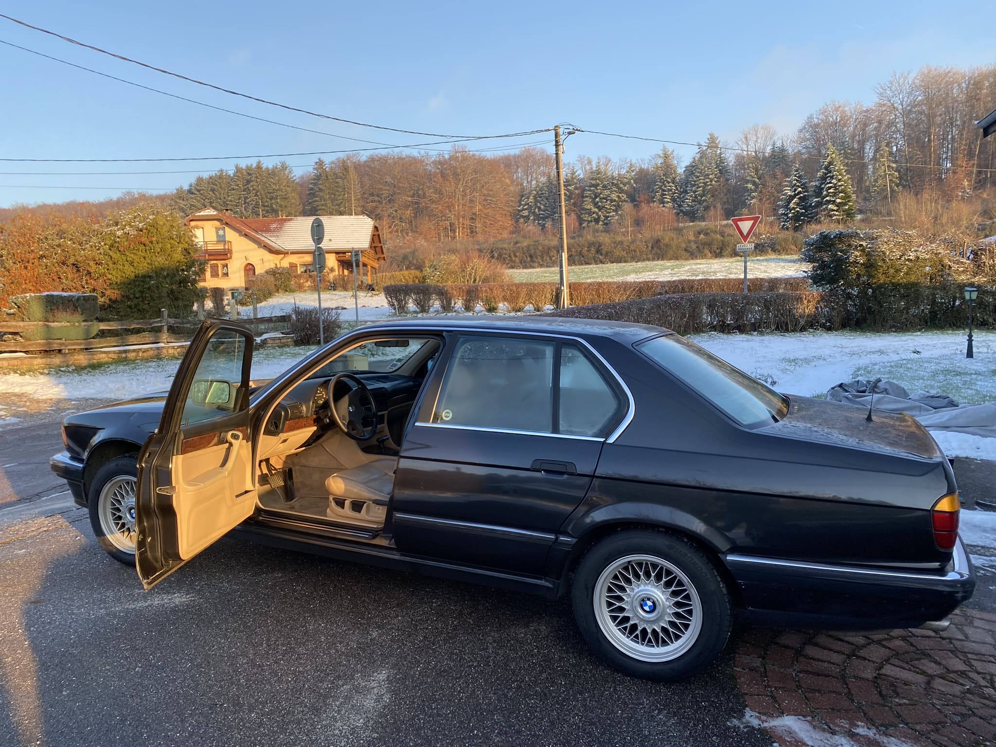 La voiture, une e32 donc, 735i de 1989, boitoto, noir diamant-schwarz, intérieur cuir beige, toit ouvrant électrique, clim auto (à recharger ou convertir), régulateur de vitesse et décatalysée d’origine