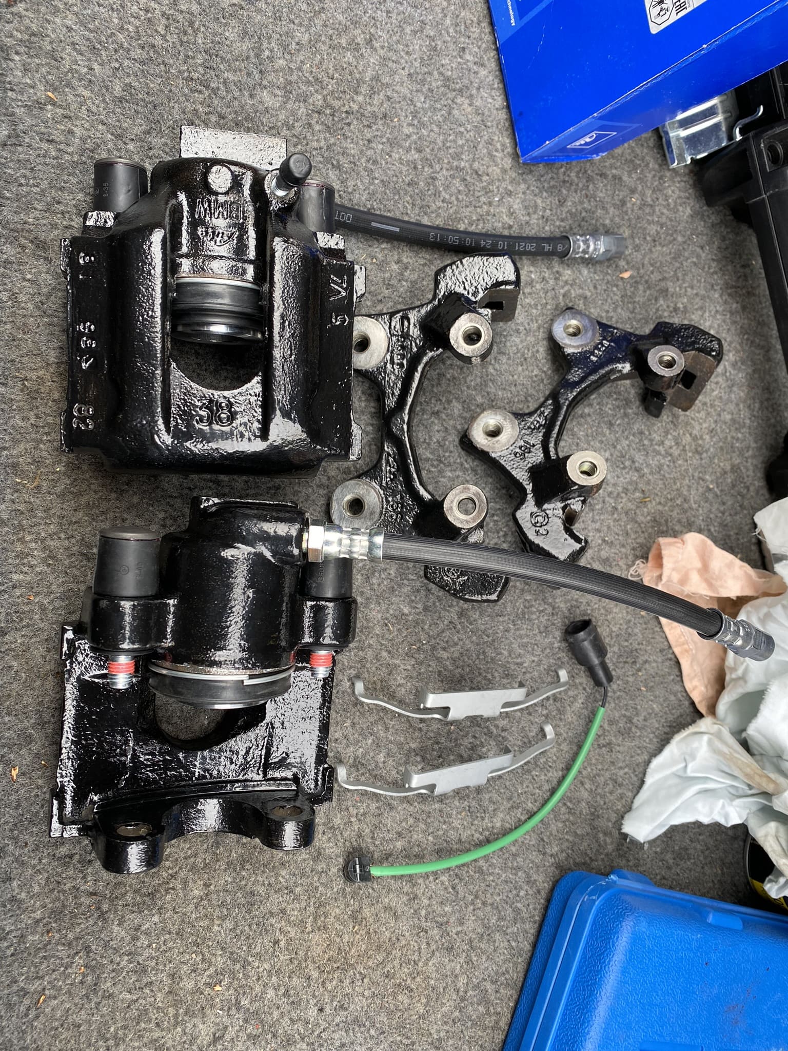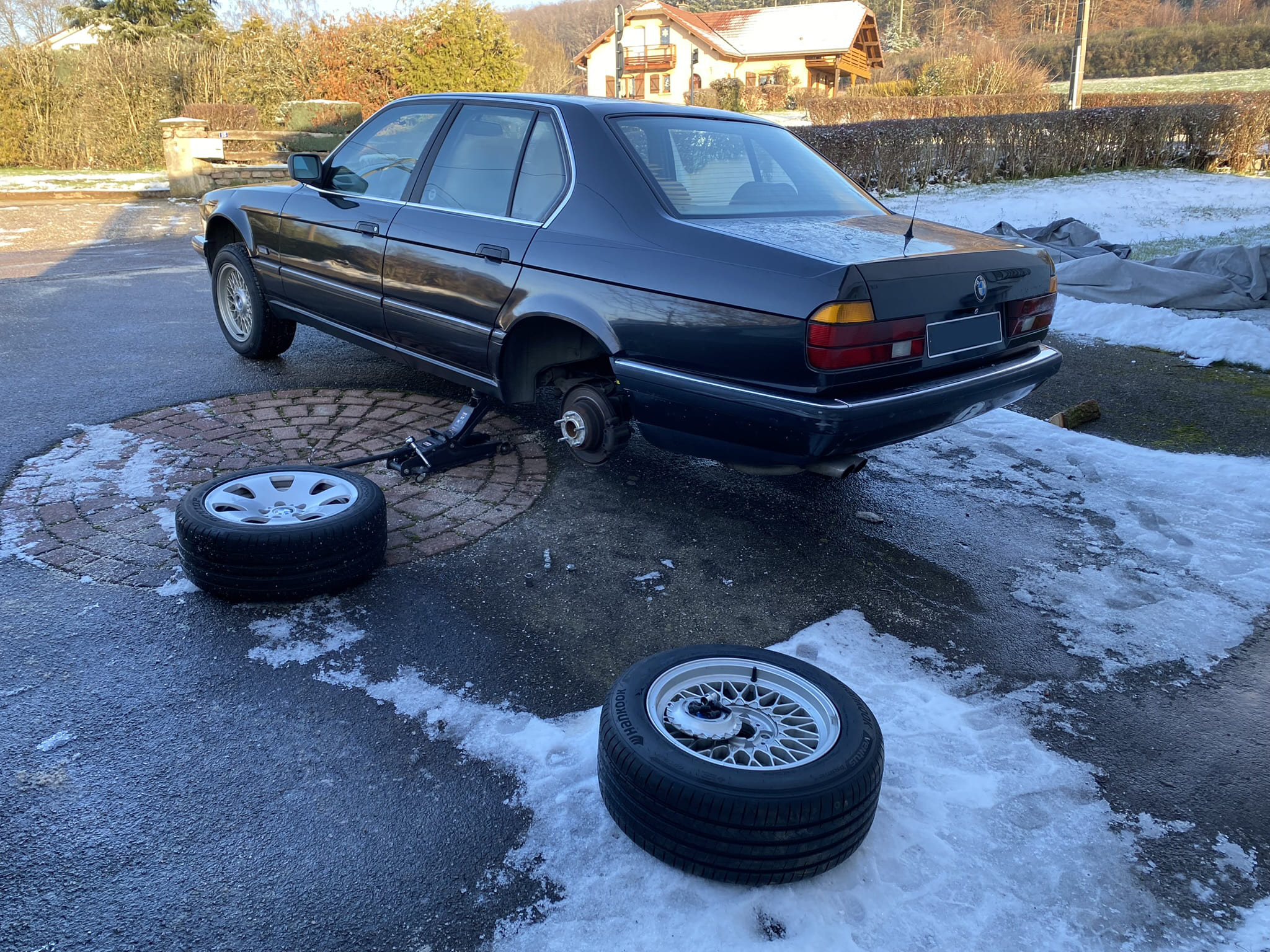 Première chose dont je me suis occupé, les roues : les jantes style 165 n’était pas du tout à mon goût, et les pneus avait 10 ans et étaient secs comme du bois, donc pour rentrer des Vosges par -10°C pas terrible… ça n’a pas été facile à trouver à prix correct mais j’ai fini par dégoter en Allemagne des BBS RZ469 (style 5 origine e38, 16 pouces en 8 de large ET23). Je m’en suis tiré pour 450€ livrées. Pour accompagner ça, 4 Hankook ventus prime 4 en 225/55R16.