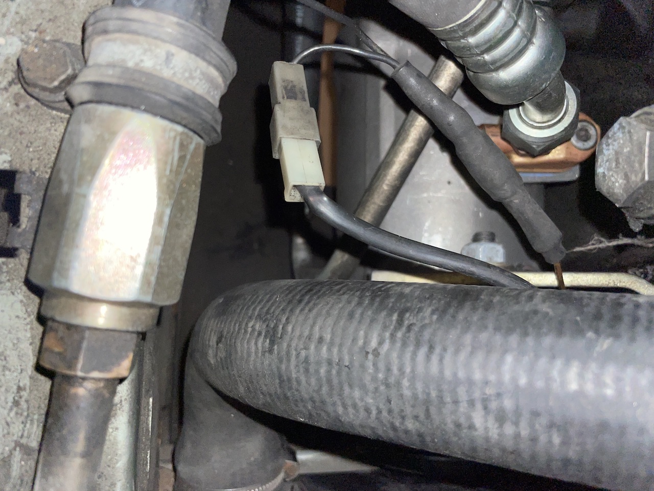 Voir sur la photo le branchement du compresseur/embrayage. on voit un bout de fil marron (a droite au milieu) venant du compresseur et entrant dans une gaine d'ou sortent 2 fils. L'un vers le connecteur et l'autre vers C106 (connecteur entre compresseur et cutoff pression). De l'autre cote, un gros fil retournant vers le compresseur/embrayage.