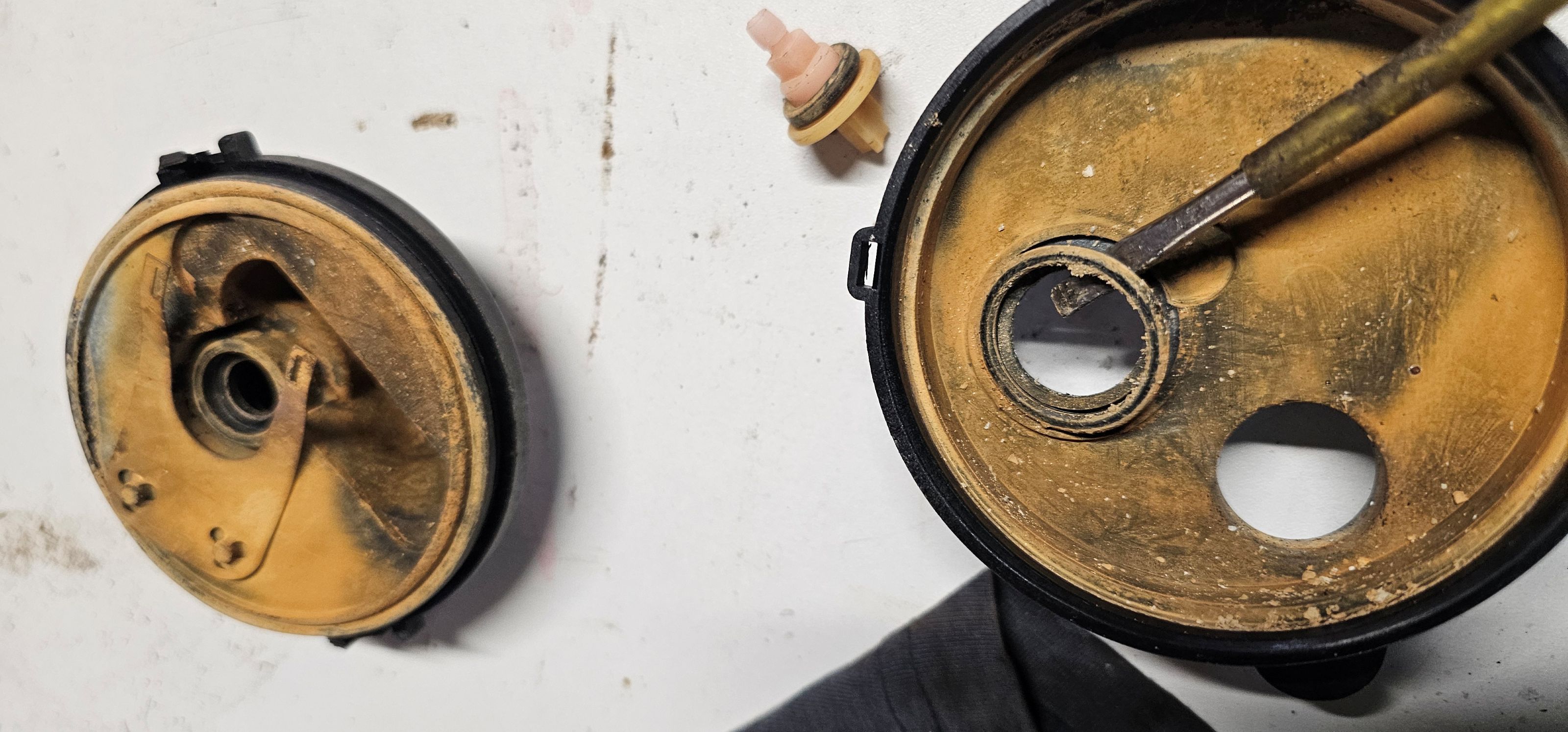 Deuxième étape, démonter la vanne. On fait d'abord levier avec un tournevis pour sortir la petite pièce d'entrainement. Ensuite on ouvre la vanne et on la démonte. C'est assez simple, on enlève les 3 joints toriques qui seront surement très dure et cassants.