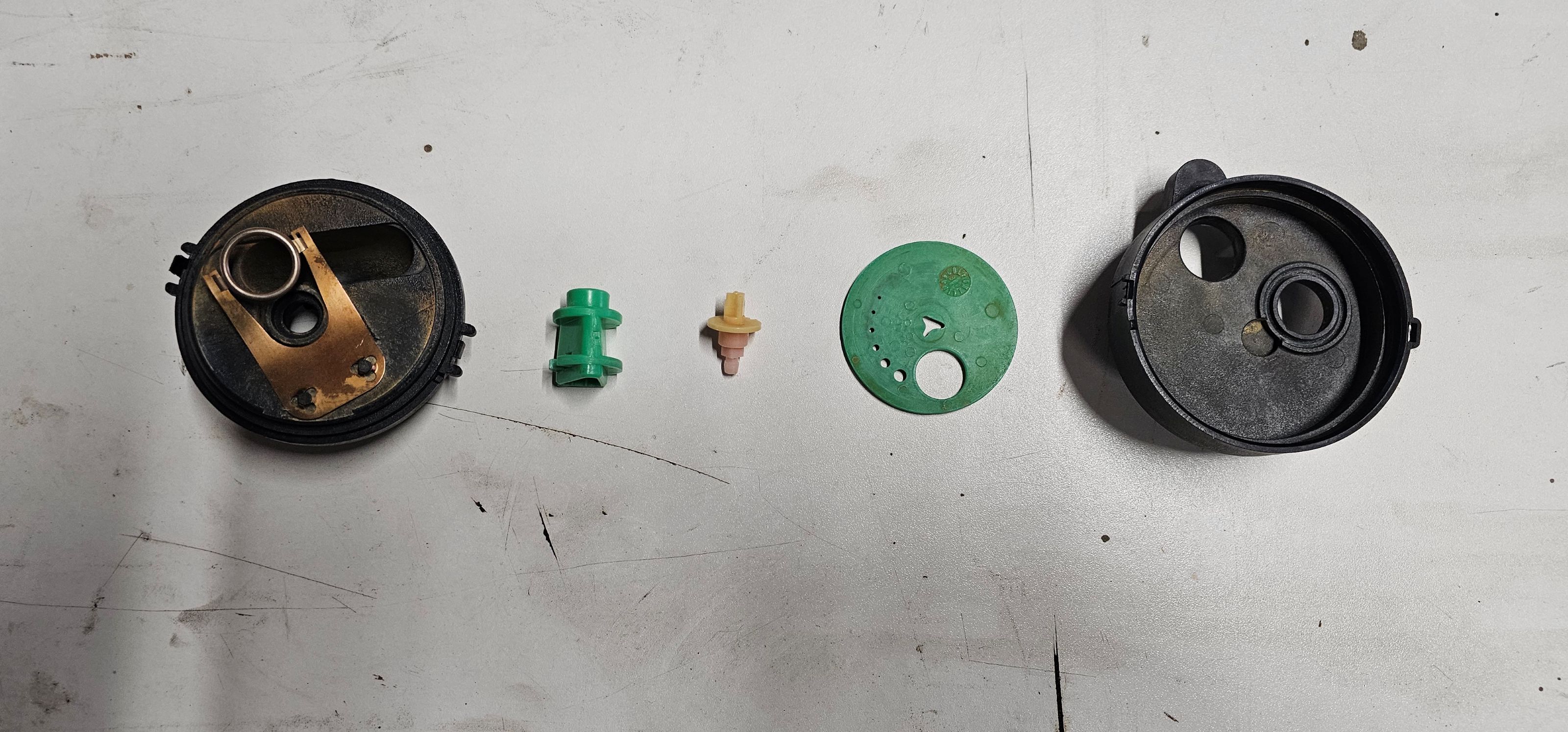 Ensuite on nettoie tout bien et on doit se retrouver avec les pièces suivantes. Attention à pas perdre le petit anneau en métal attaché au ressort à l'intérieur :